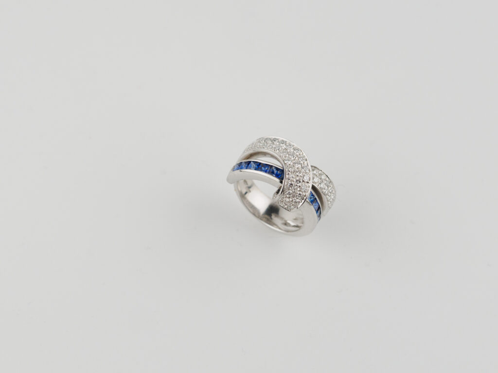 Anello in oro 18kt con pavè di diamanti e zaffiri.