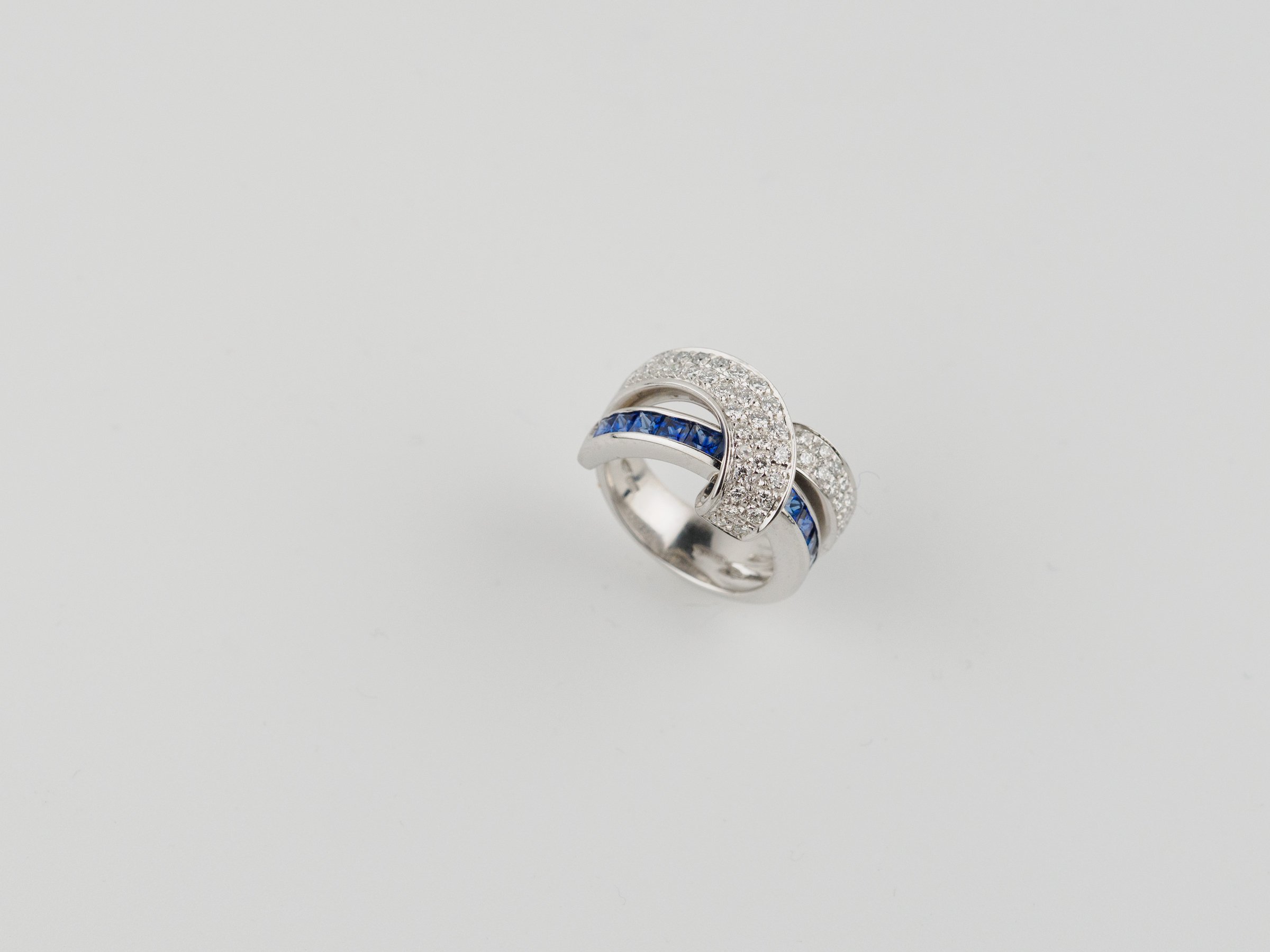 Anello in oro bianco 18kt con pavè di diamanti taglio brillante e fila di zaffiri taglio princess.