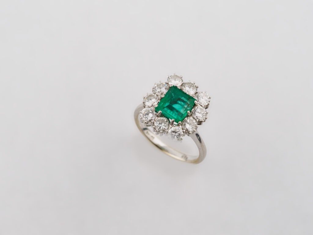 Anello in oro bianco 18kt con smeraldo rettangolare centrale contornato da diamanti taglio brillante.