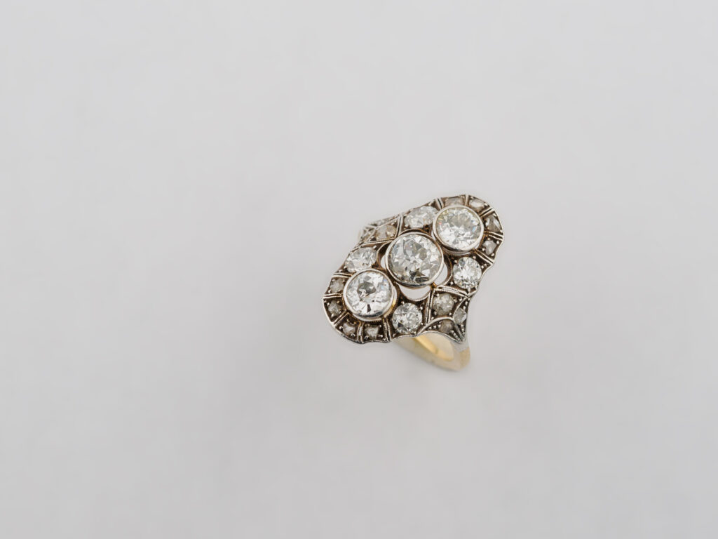 Anello in oro giallo 18kt e argento “Decò” con tre diamanti centrali e vari diamanti su trame geometriche laterali.