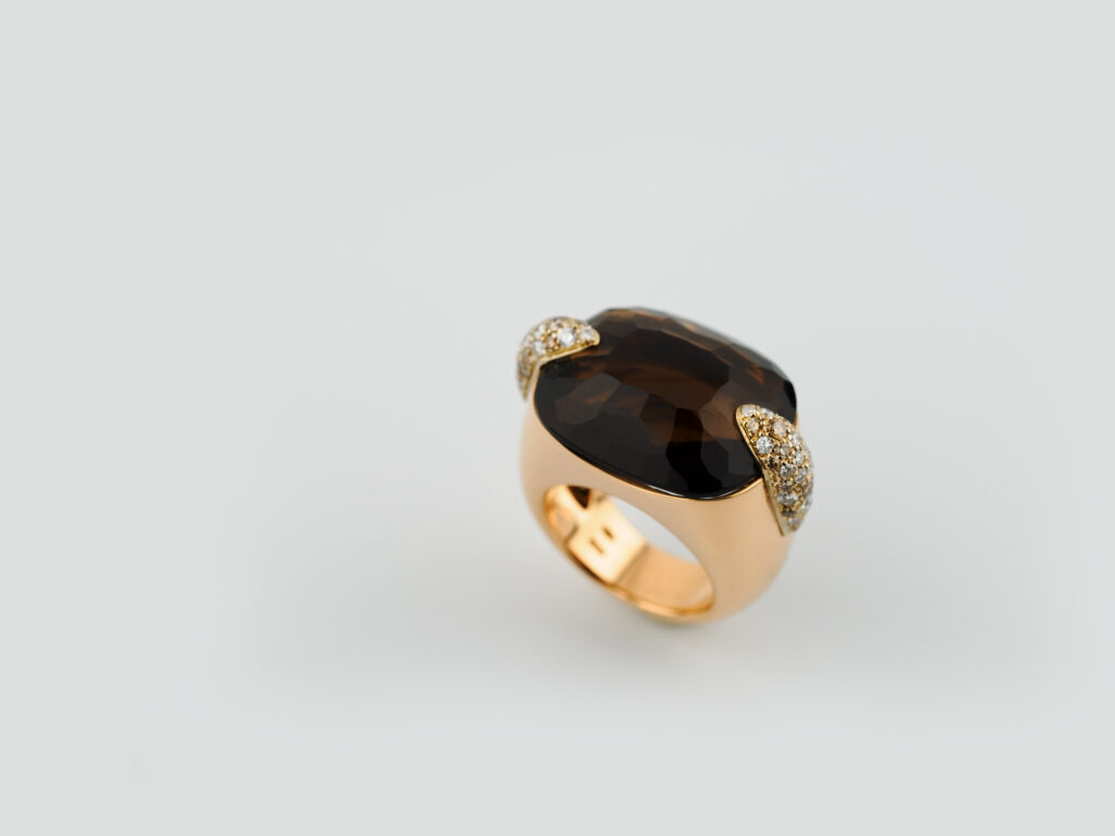 Anello in oro rosa 18kt con quarzo fumè e griffe con pavè di diamanti firmato “Pomellato”.