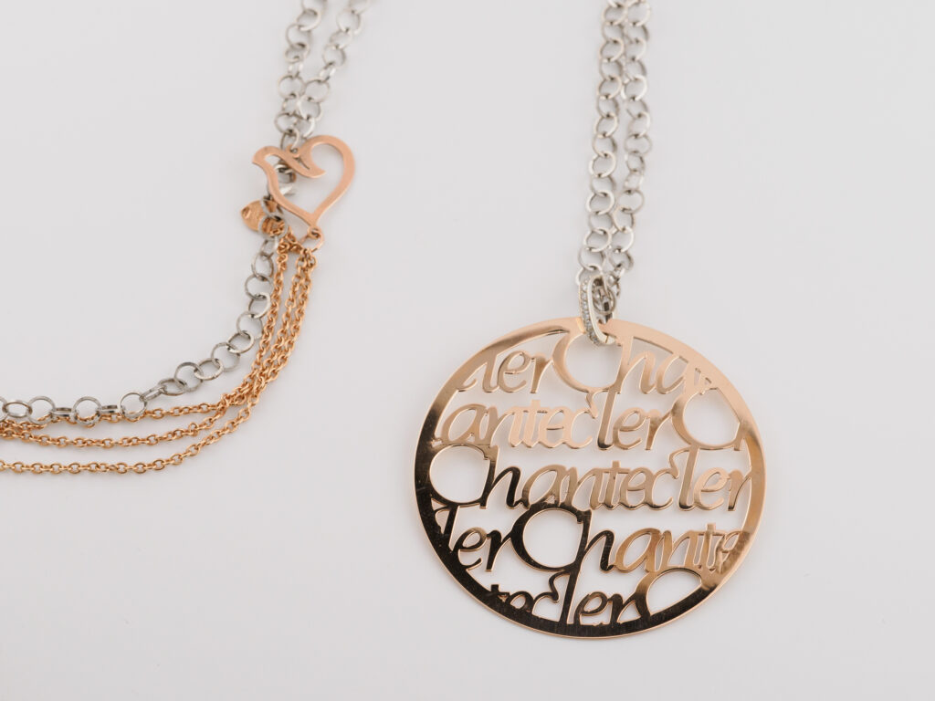 Ciondolo in oro rosa 18kt firmato “Chantecler” con catena in acciaio e oro a titolo basso 9kt.
