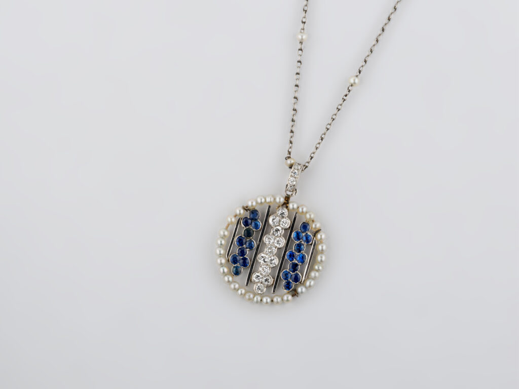 Collana con pendente in platino con diamanti taglio vecchio, zaffiri e perline.