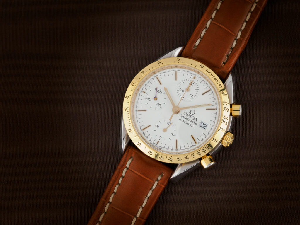 Omega Speedmaster Automatic Reduced in oro e acciaio con quadrante bianco e cinturino in pelle.