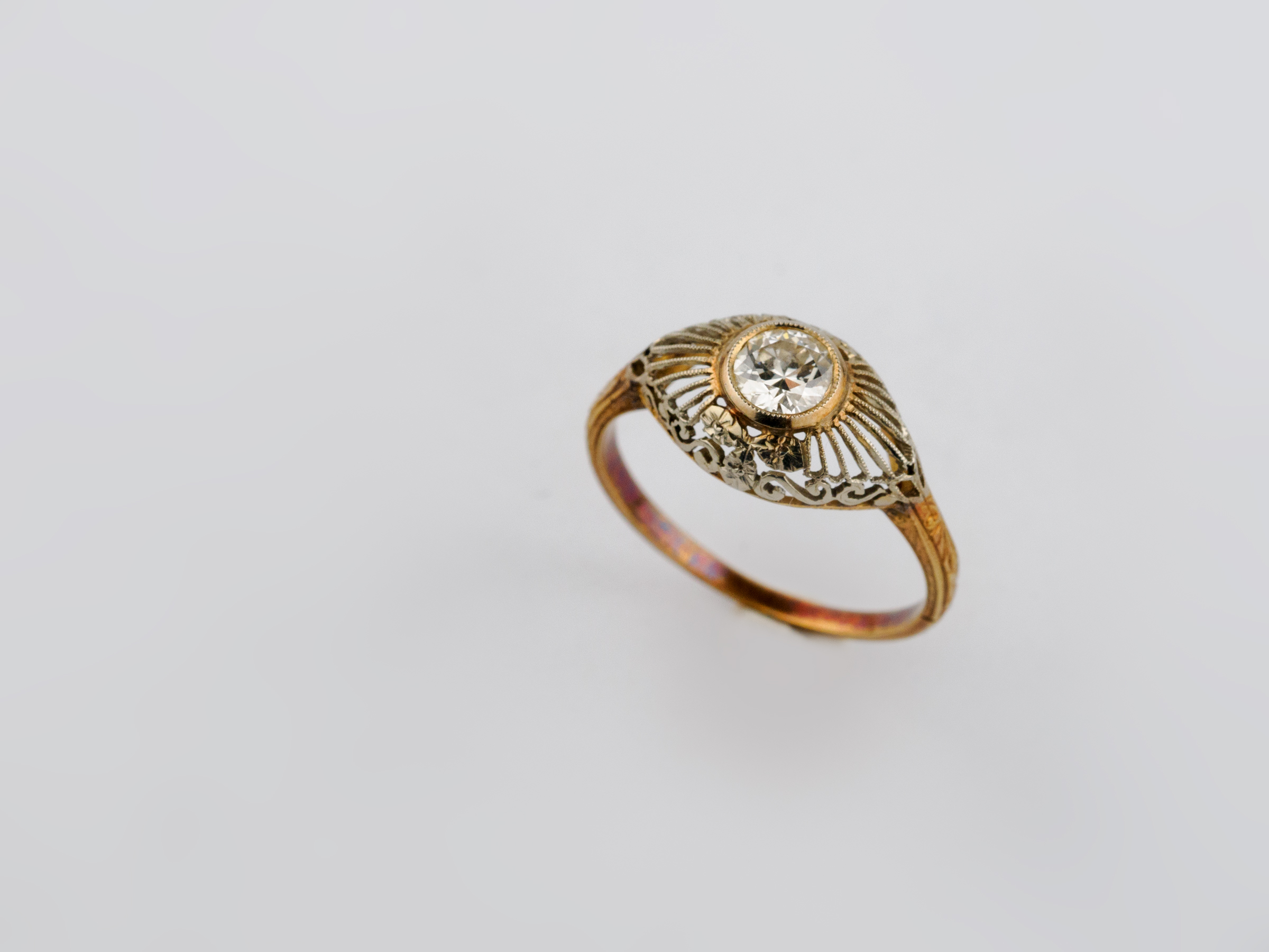 Spilla in oro e argento "Rametto" con diamanti taglio antico.