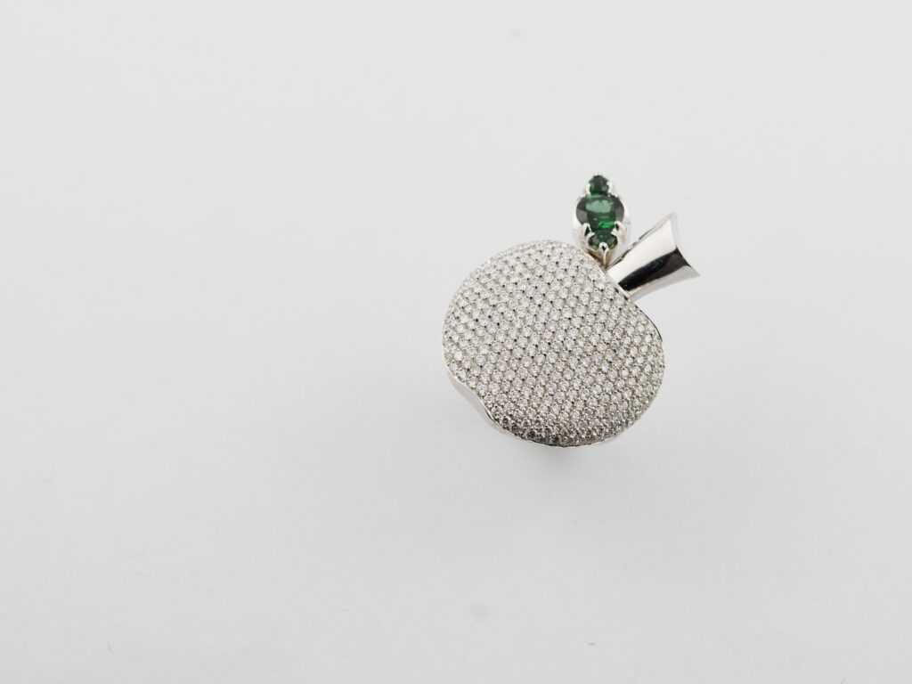 Anello in oro bianco 18kt a forma di mela con pavè di diamanti taglio brillante. Firmato Pasquale Bruni.
