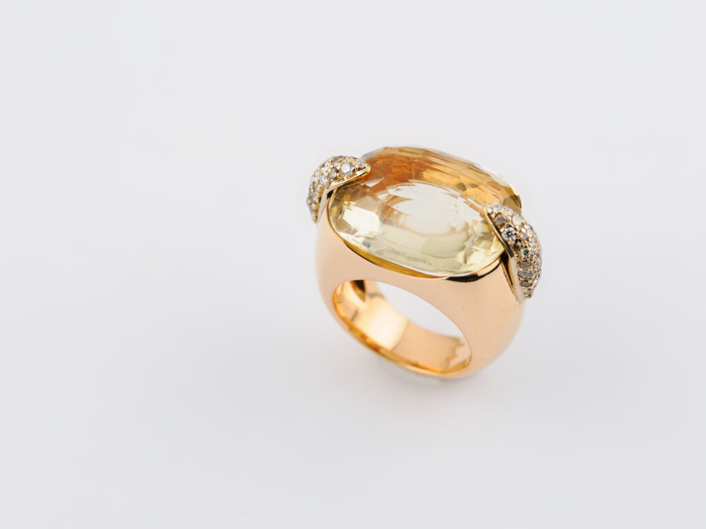 Anello in oro rosa 18kt con quarzo “lemon” centrale e griffe con pavè di diamanti. Firmato “Pomellato”.