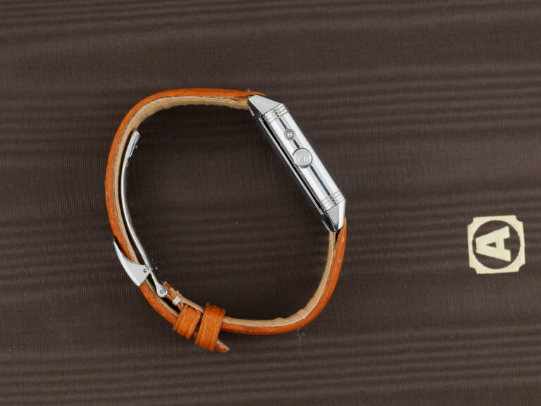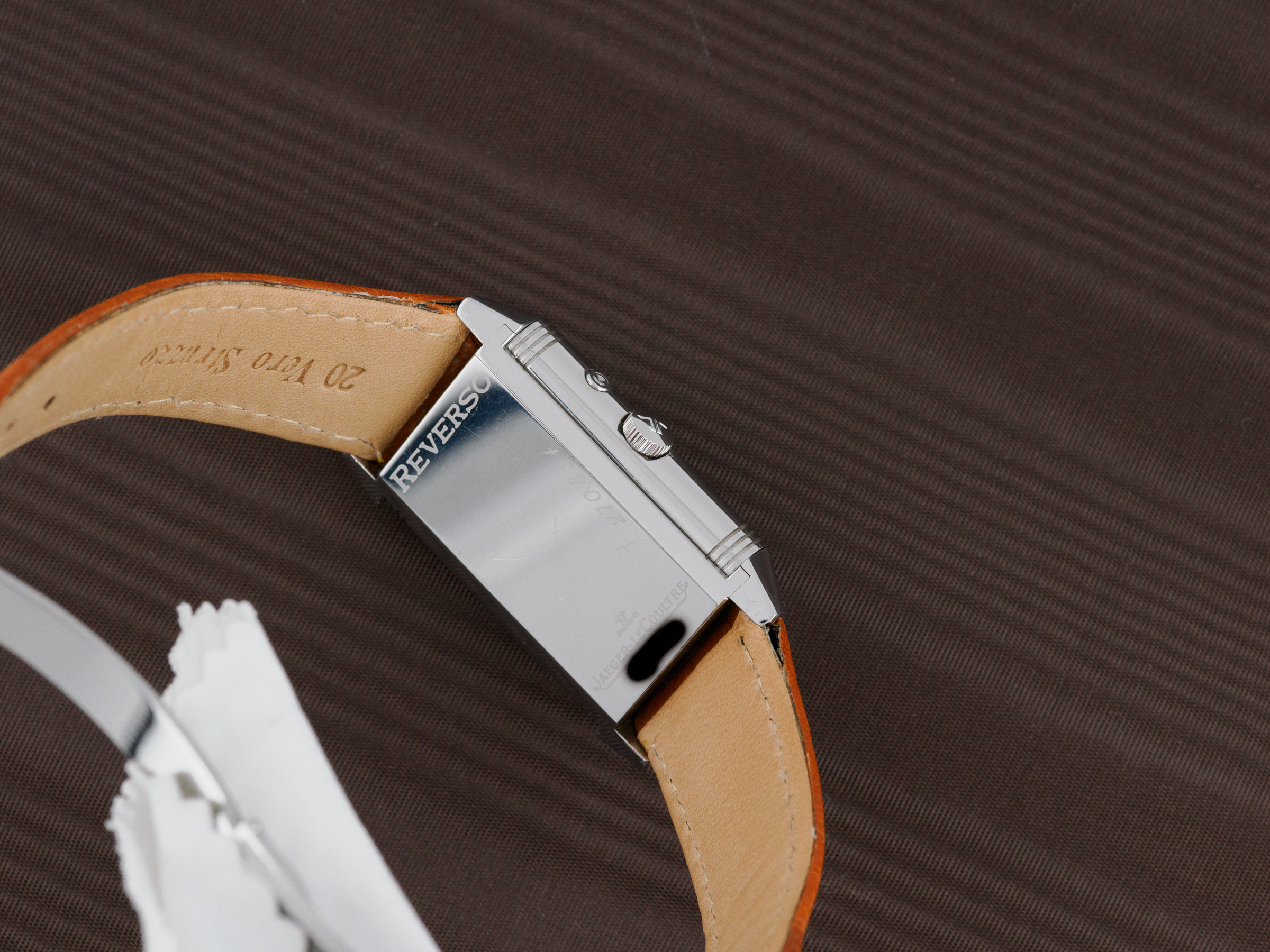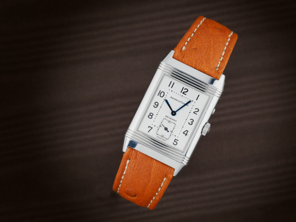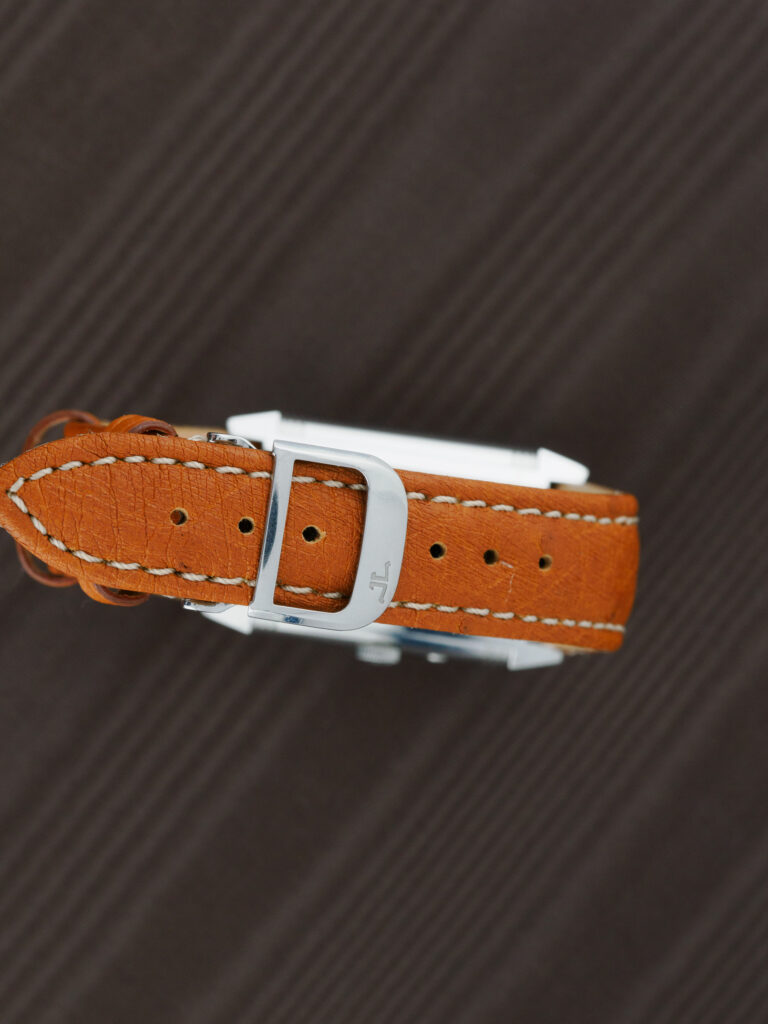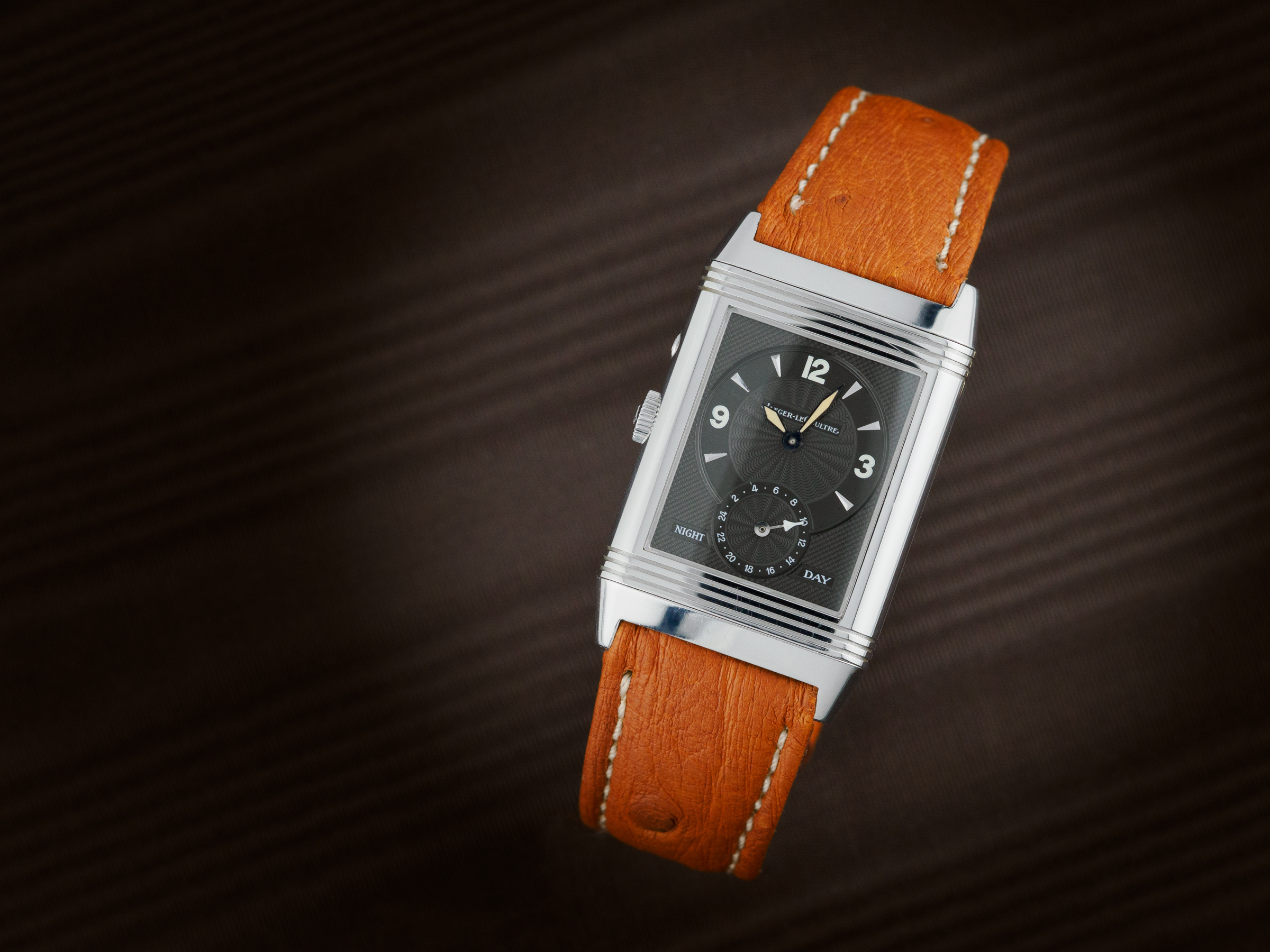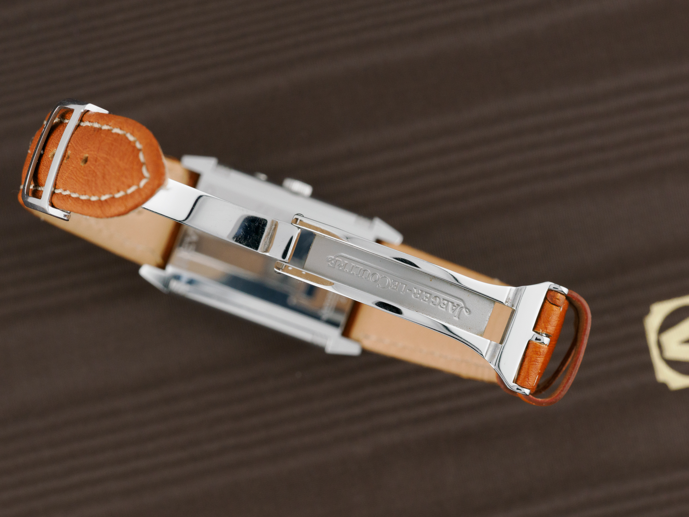 Jaeger Le Coultre Reverso Duo Face in acciaio con cinturino in pelle e fibbia deployante.