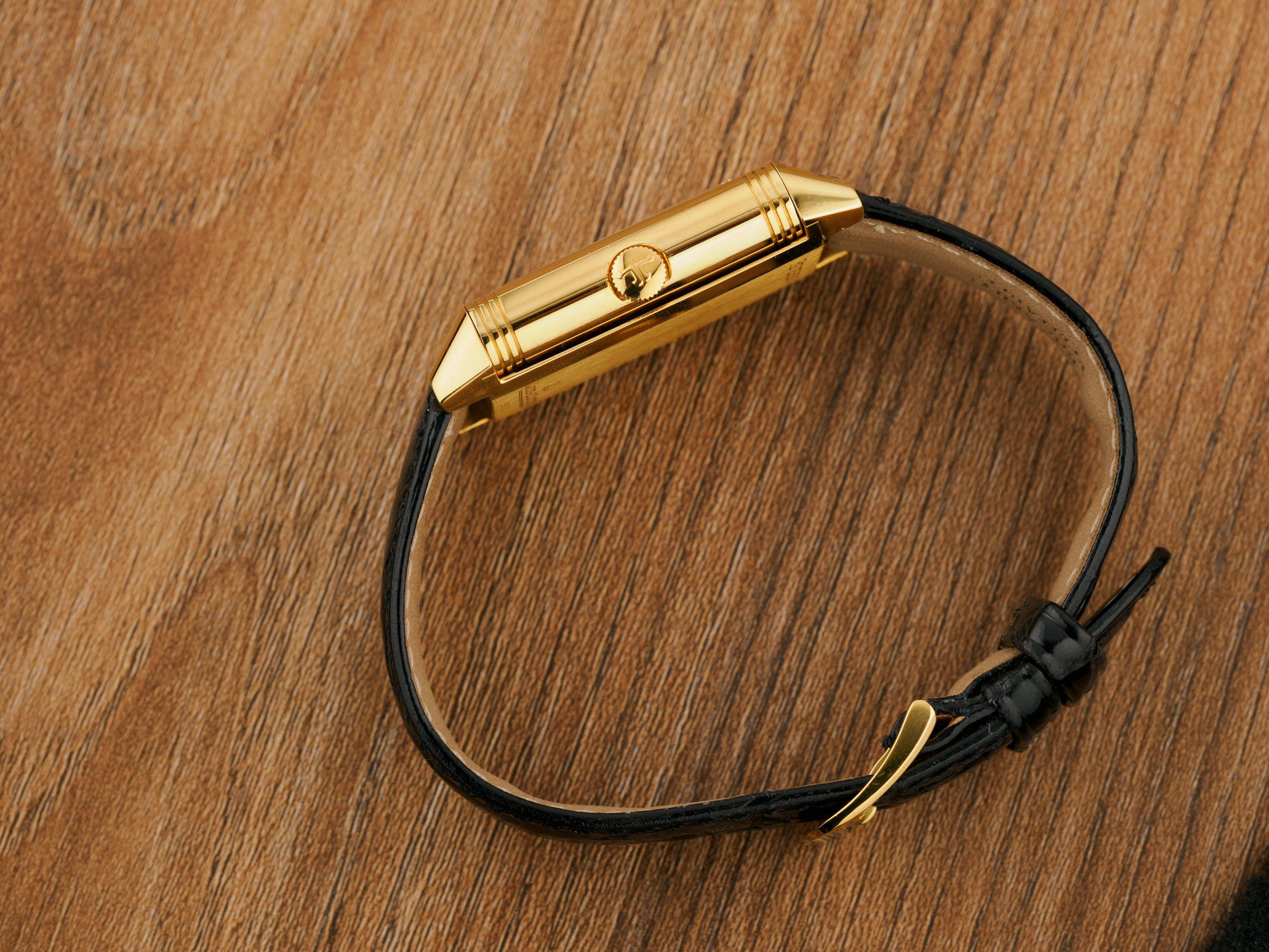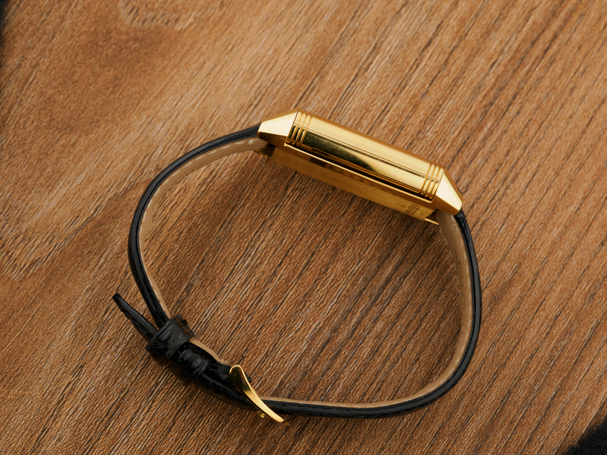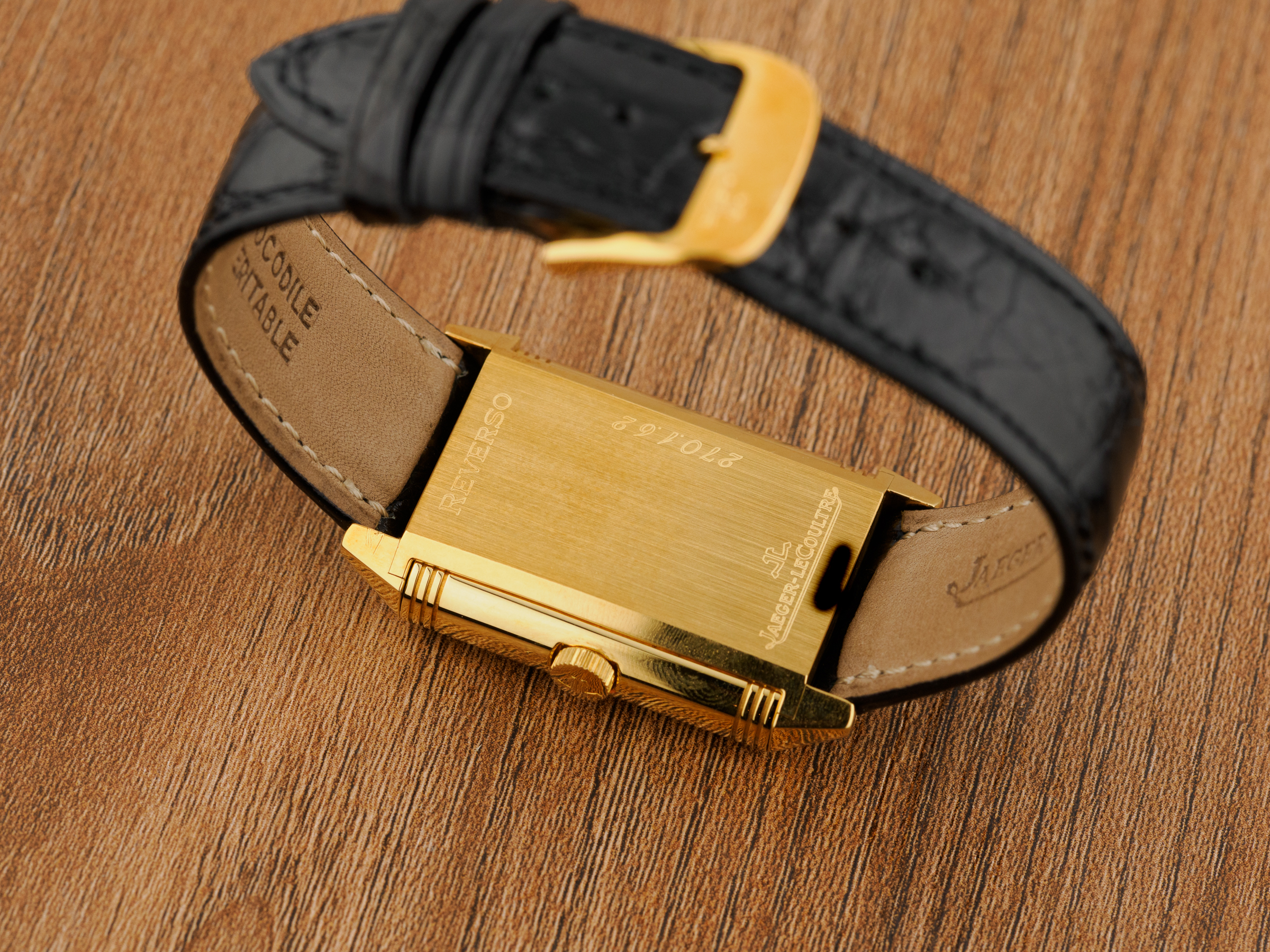 Jaeger Le Coultre Reverso Gran Taille in oro giallo 18kt con cinturino in pelle e fibbia ad ardiglione in oro giallo 18kt.