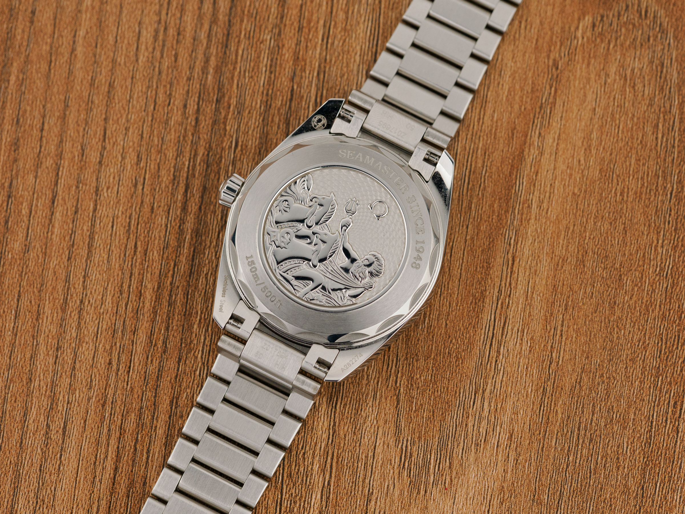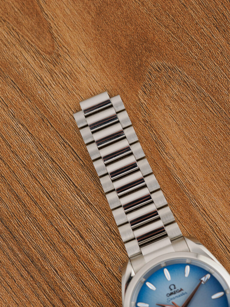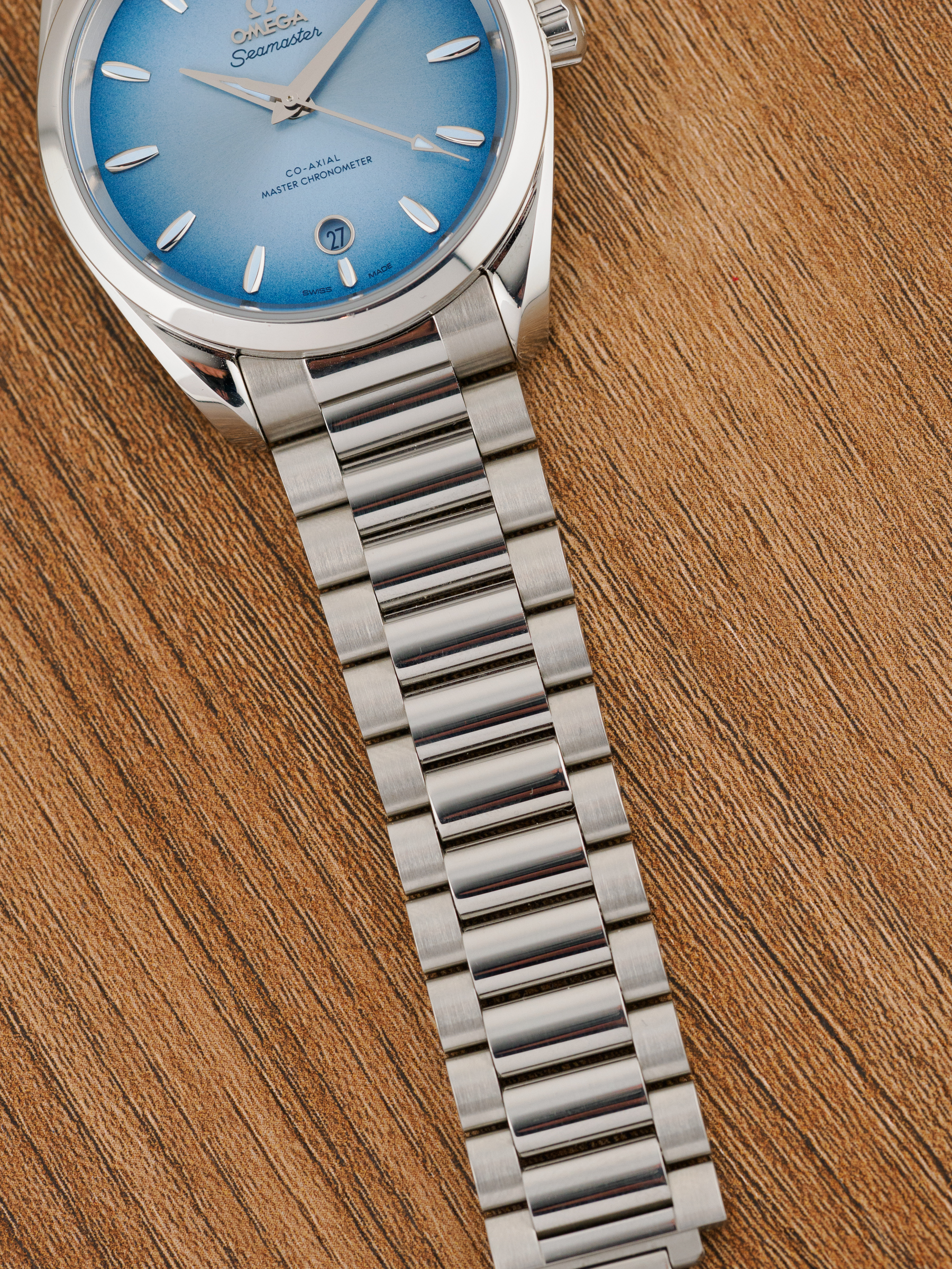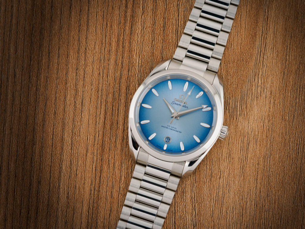 Omega Seamaster Aqua Terra 150M in acciaio con quadrante azzurro.