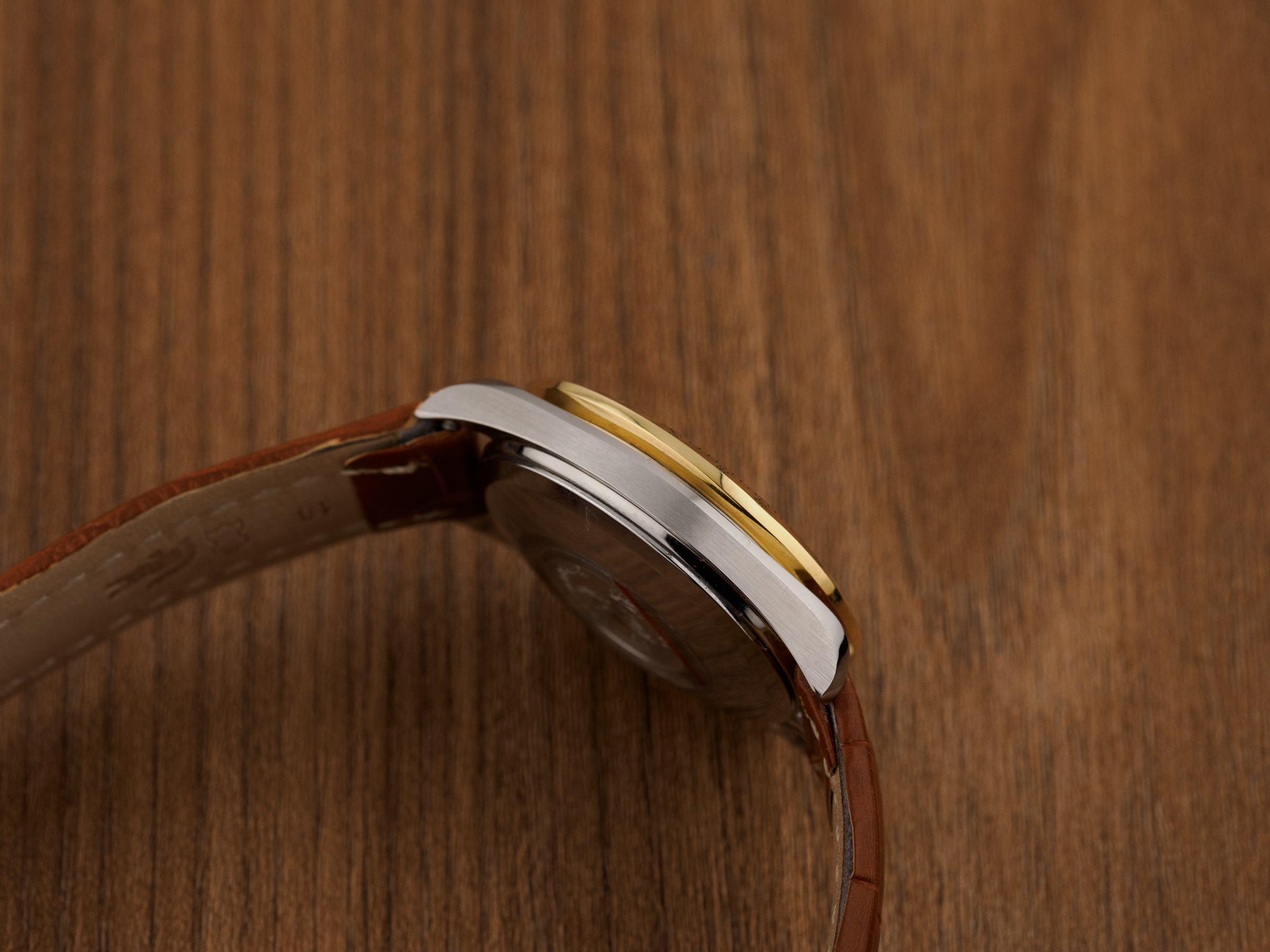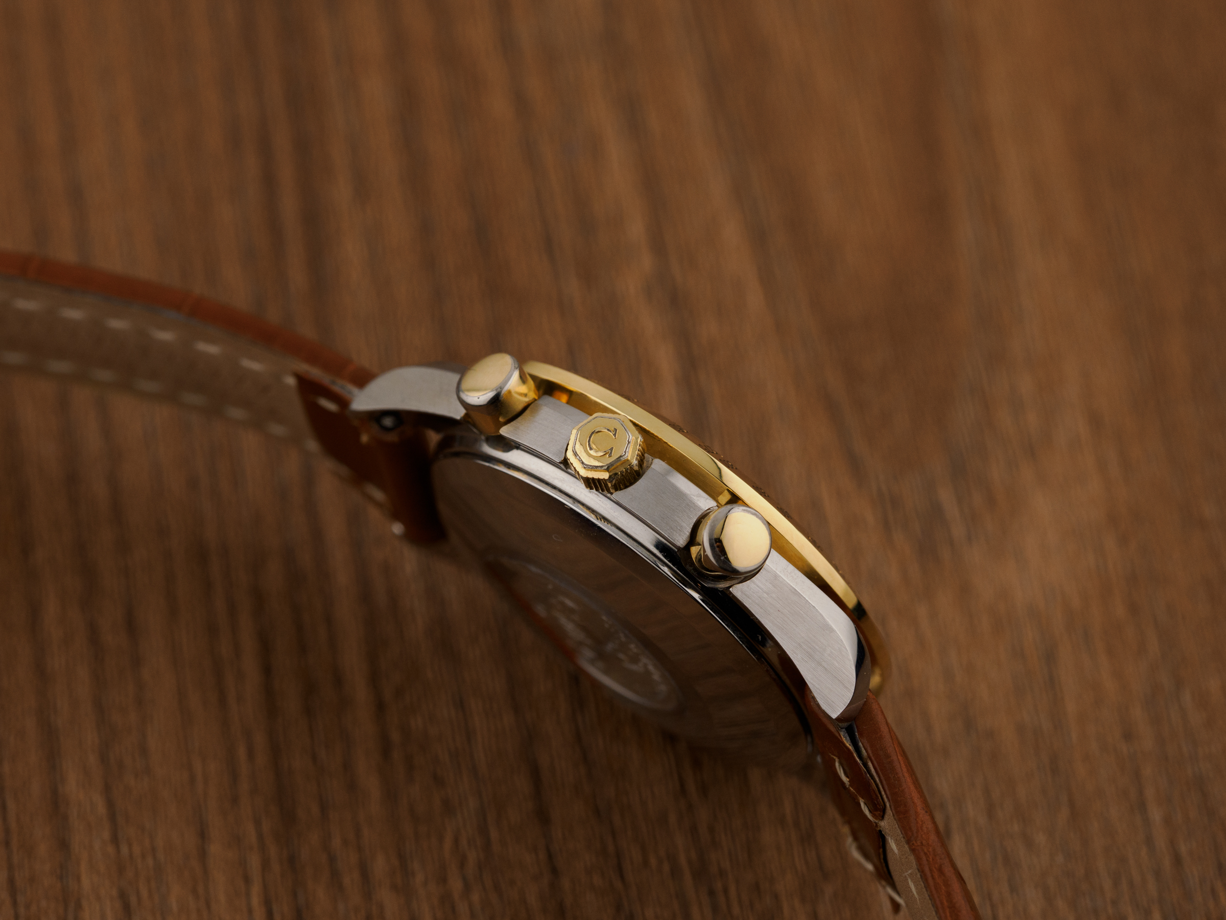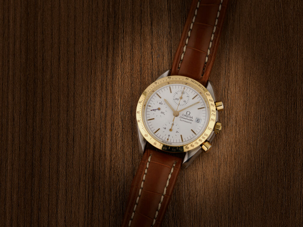 Omega Speedmaster Automatic Reduced in oro e acciaio con quadrante bianco e cinturino in pelle.