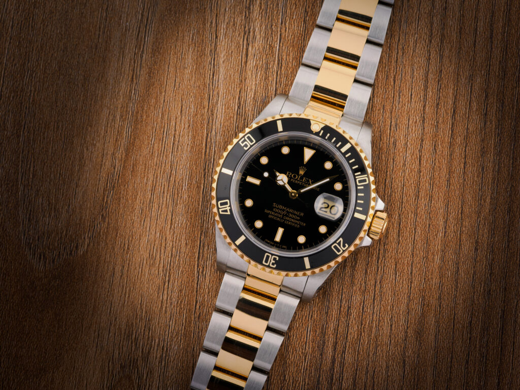 Rolex Submariner in oro e acciaio con quadrante nero.